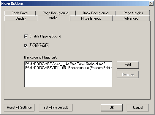 - More Options - вкладка Audio: поставив галочку в окне Enable
